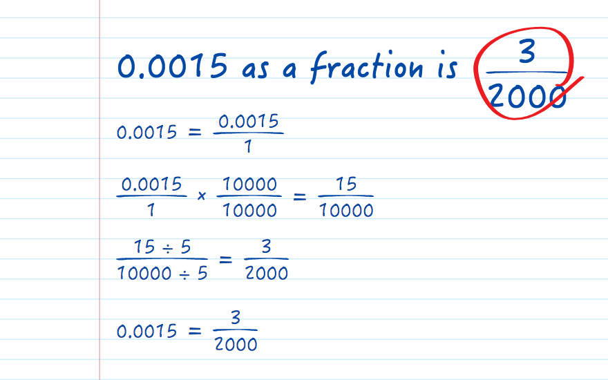 To convert 0.0015 to a fraction you need to multiply 0.0015/1 by 10000/10000 and you’ll get 15/10000. This result can be further reduced to 3/2000.