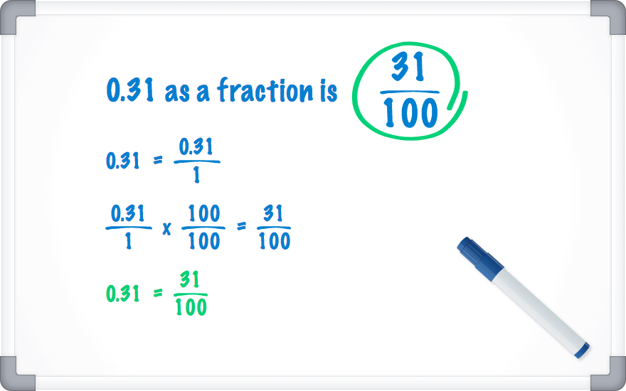 Converting 0.31 to a fraction requires multiplying 0.31/1 by 100/100 resulting into 31/100, a fraction which cannot be simplified any further.
