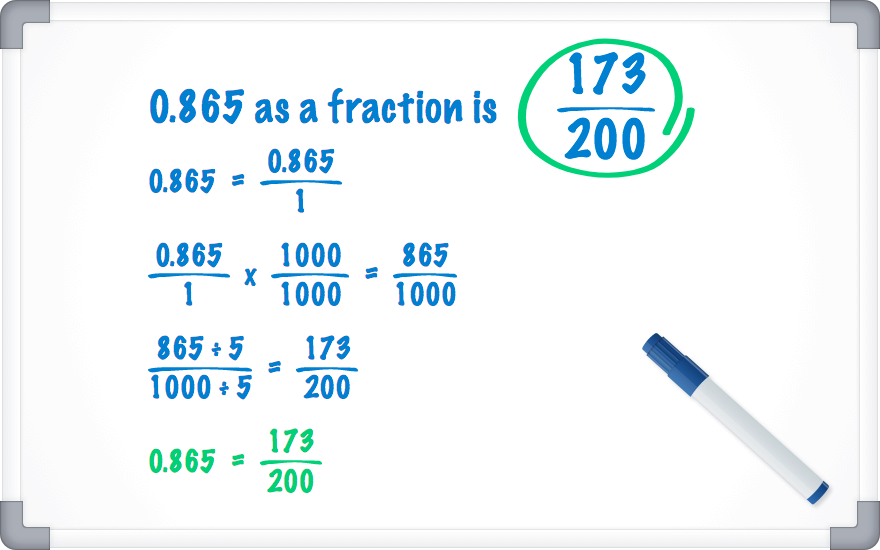 Converting 0.865 to a fraction requires multiplying 0.865/1 by 1000/1000 resulting into 865/1000. This fraction can be further reduced to 173/200.
