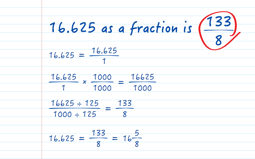 To convert 16.625 to a fraction you need to multiply 16.625/1 by 1000/1000 and you’ll get 16625/1000. This result can be further reduced to 133/8. Since this is an improper fraction you can also write it as a mixed number 16 5/8.
