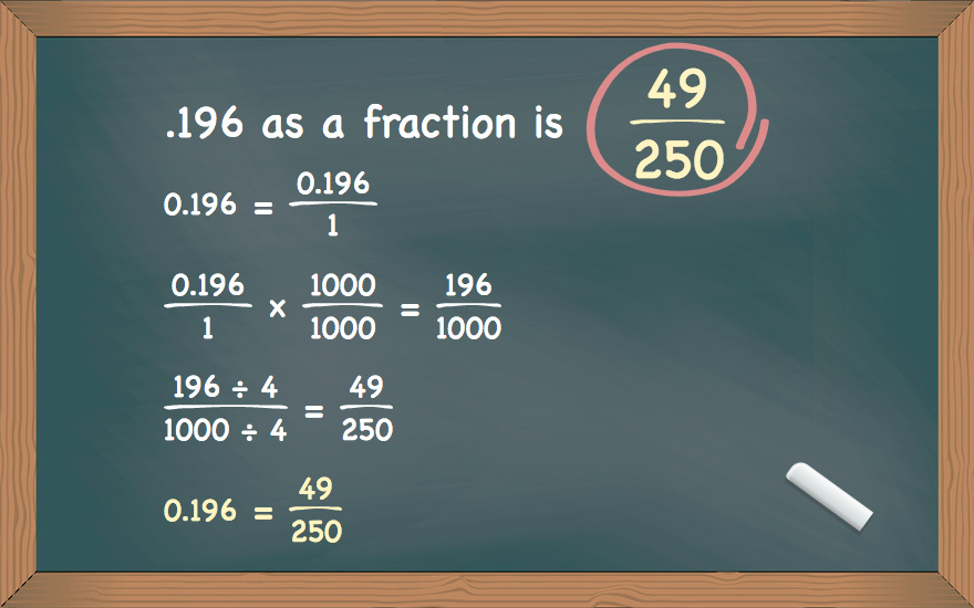 Writing .196 as a fraction requires us to multiply 0.196/1 by 1000/1000 which will result in 196/1000. Simplifying further we get the final answer: 49/250.
