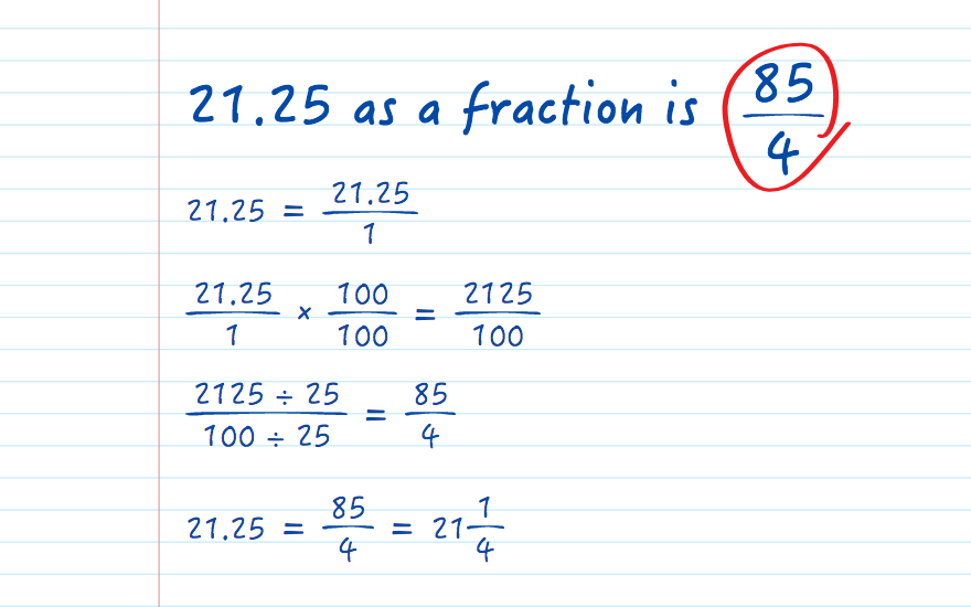 Here are the steps to convert a decimal to a fraction, more specifically how to get 21.25 as a simplified fraction: