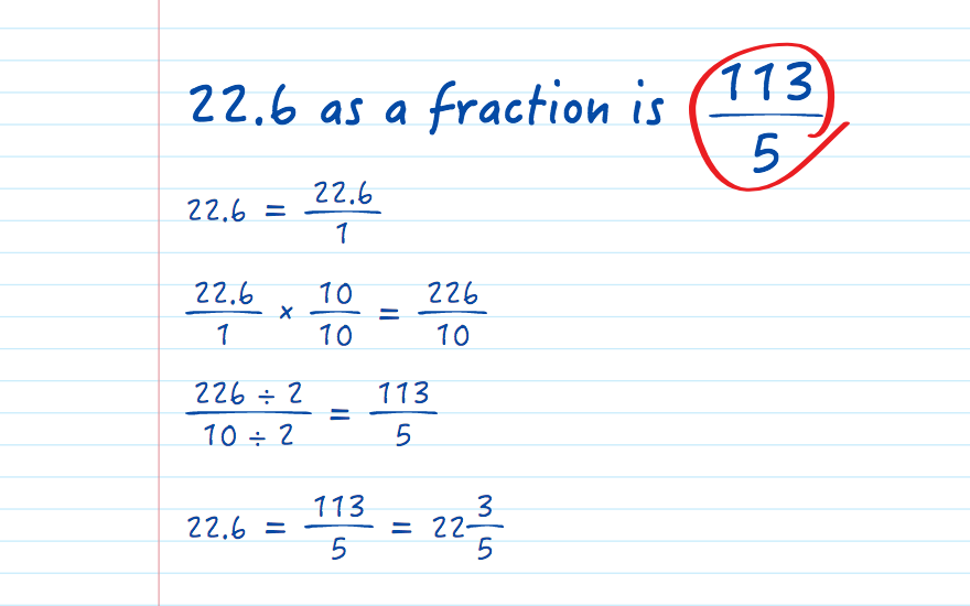 Here are the steps to convert a decimal to a fraction, more specifically how to get 22.6 as a simplified fraction: