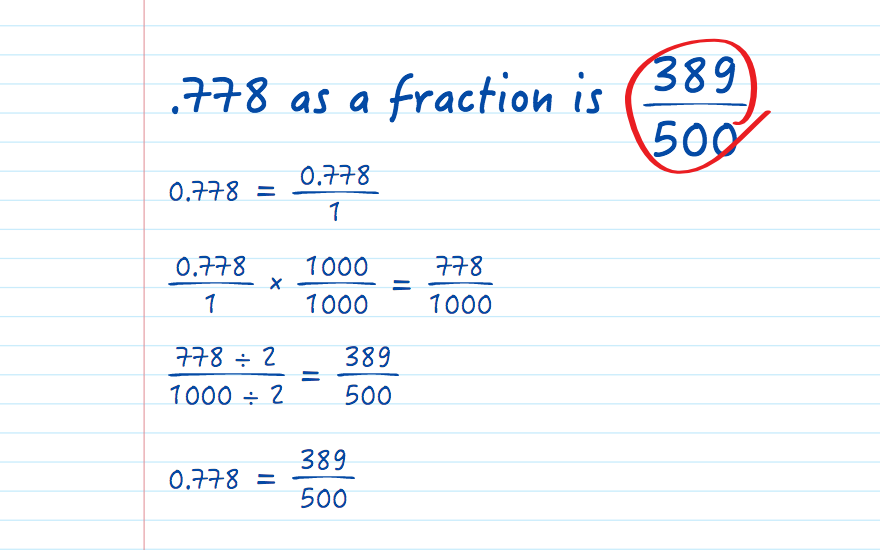 To convert .778 to a fraction you need to multiply 0.778/1 by 1000/1000 and you’ll get 778/1000. This result can be further reduced to 389/500.